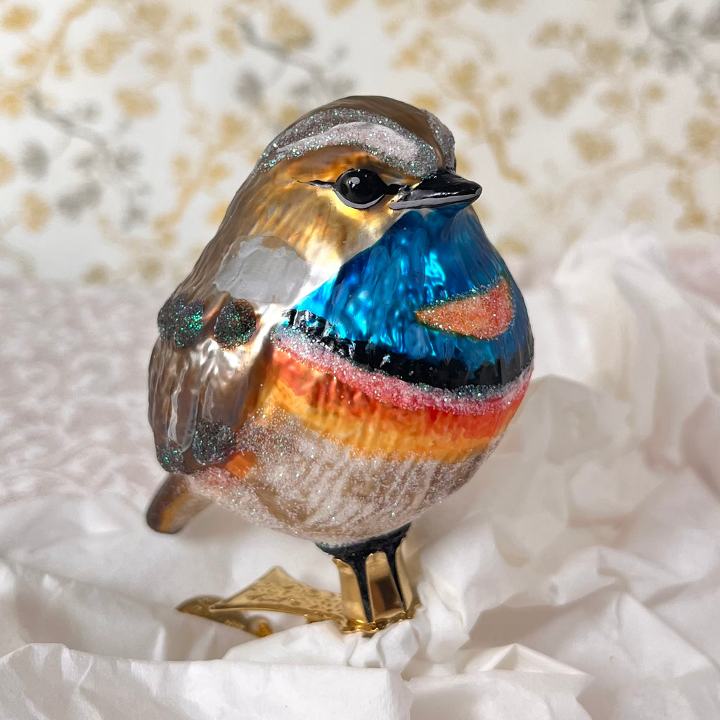Blåstrupe på clip, ca 8 cm høy og 10 cm fra nebb til haletipp.  Munnblåst glass (figurer og egg blir blåst i en form, kuler blir blåst «fritt»), dekorert for hånd.