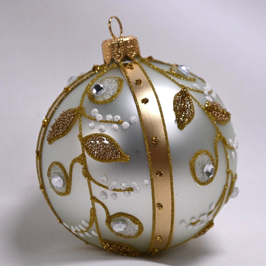 "Eleanore" julekule i munnblåst, håndmalt glass. 8 cm julekule i en delikat, matt lys grønn bunnfarge, med detaljer i hvitt og gull og pyntet med blanke glassperler.