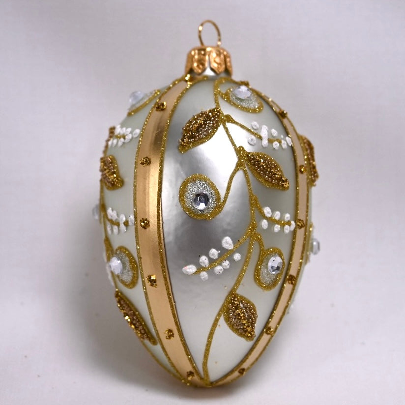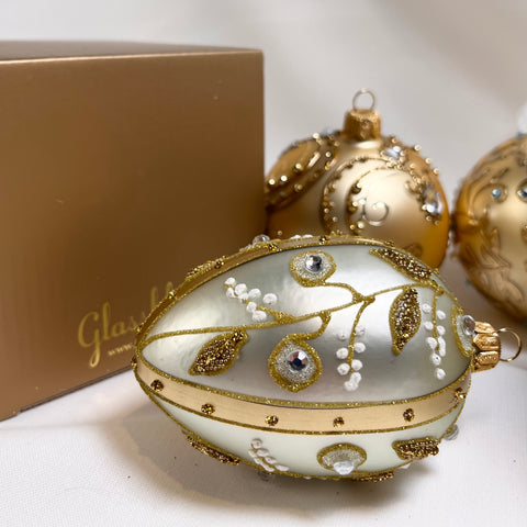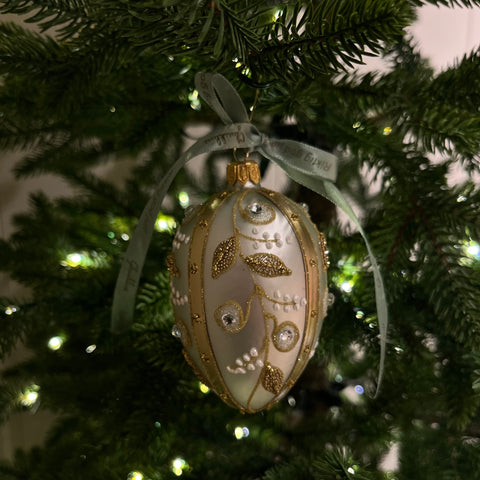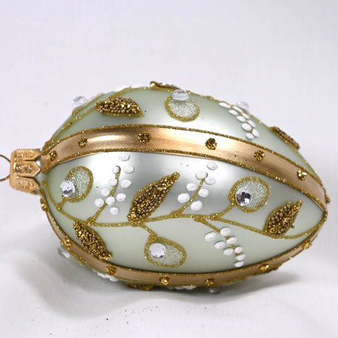 Eleanore julekule, ca 11 cm. Eggformet glasskule. Matt, ekstra lys grønn og svært delikat bunnfarge, med detaljer i gull og hvitt. Glassperlene gir veldig fint skinn når de blir belyst - for eksempel fra juletrebelysningen. Eleanore finnes både som eggformet og rund kule i denne lekre grønnfargen.