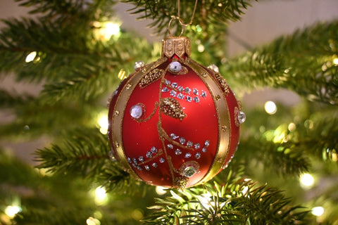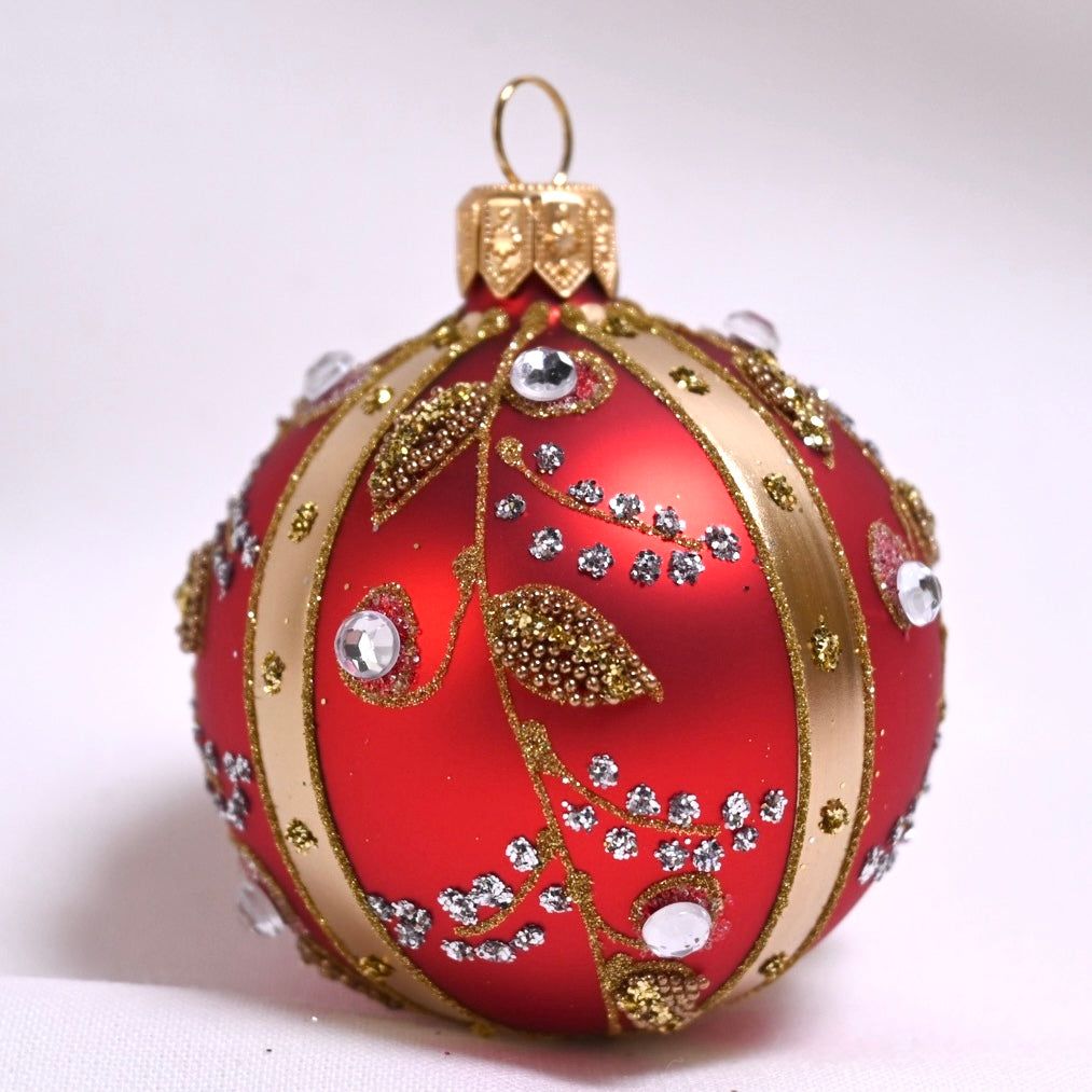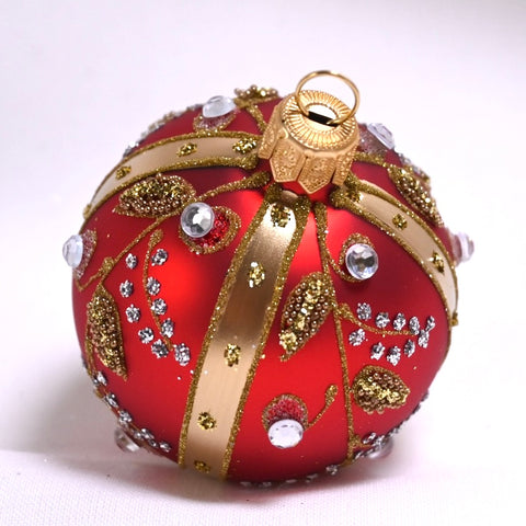 Liten "Eleanore" julekule, 6 cm. i diameter. Munnblåst og håndmalt glasskule, matt rød bunnfarge med detaljer i gull og blanke glassperler.
