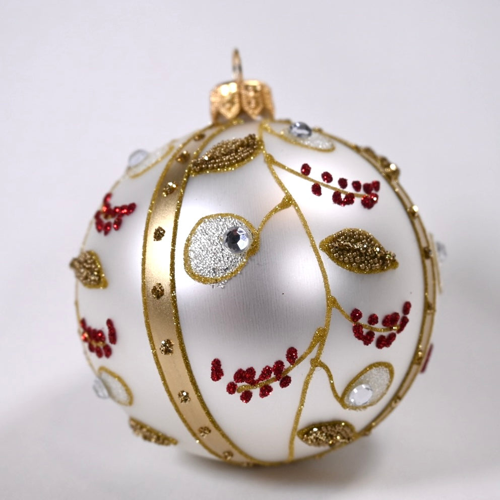 "Eleanore" julekule i munnblåst, håndmalt glass. 8 cm julekule i en rålekker, matt hvit bunnfarge, med gulldekor, røde bær og blanke glassperler.