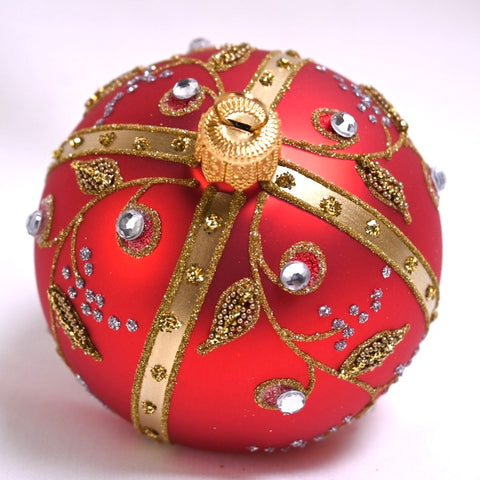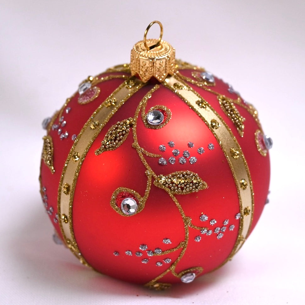"Eleanore" julekule, 8 cm. i diameter. Munnblåst og håndmalt glasskule, matt rød bunnfarge med detaljer i gull og sølv og blanke glassperler.