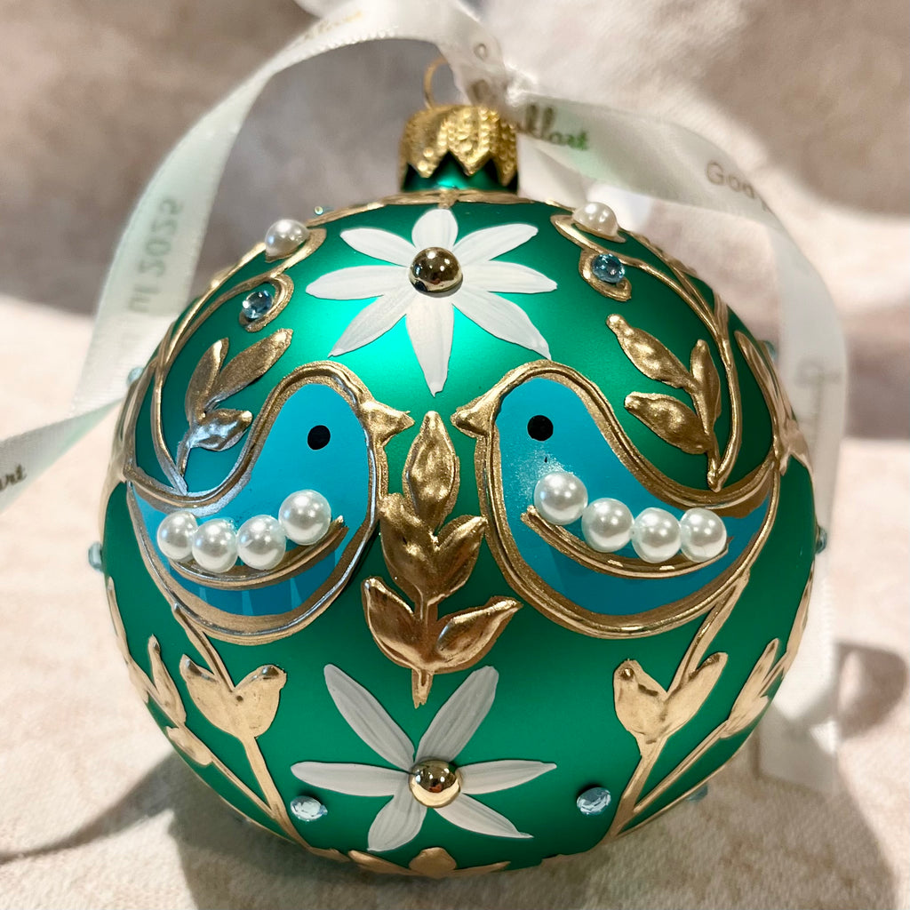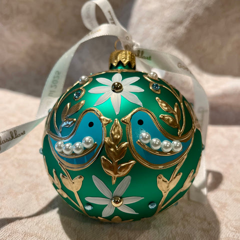Vi er stolte over å kunne presentere vakre Esperanta, vår mest forseggjorte julekule noensinne. En helt unik skatt, designet for Glassklart av Gry Solberg Ekornholmen, munnblåst og dekorert for hånd av de dyktige glasskunstnerne hos vår faste produsent utenfor Krakow. Denne julekulen er et helt lite eventyr i seg selv. Den er dekorert med en teknikk vi ikke har sett før, med et elegant gullmønster som snirkler seg rundt kulen og er påført i et tykt lag. Dette krever virkelig et godt håndlag! Legg også merke til hvordan de ulike dekorperlene er perfekt avstemt og bidrar til det luksuriøse uttrykket. Esperanta 2025 er produsert i begrenset antall. Den leveres med hvitt silkebånd med logotrykk og årstall 2025.