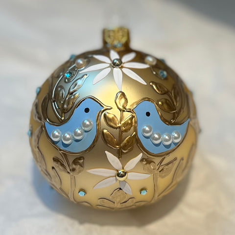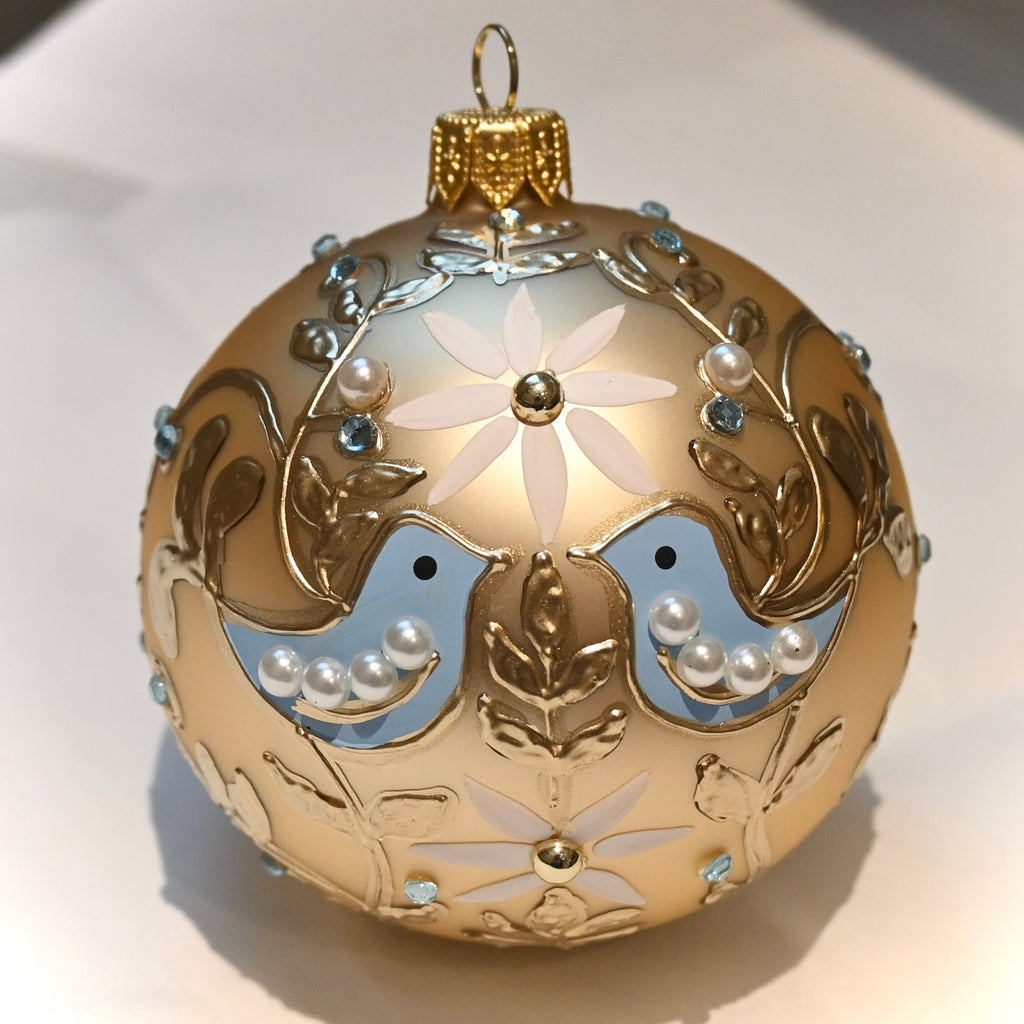 Vi er stolte over å kunne presentere vakre Esperanta, vår mest forseggjorte julekule noensinne. En helt unik skatt, designet for Glassklart av Gry Solberg Ekornholmen, munnblåst og dekorert for hånd av de dyktige glasskunstnerne hos vår faste produsent utenfor Krakow. Denne julekulen er et helt lite eventyr i seg selv. Den er dekorert med en teknikk vi ikke har sett før, med et elegant gullmønster som snirkler seg rundt kulen og er påført i et tykt lag. Dette krever virkelig et godt håndlag! Legg også merke til hvordan de ulike dekorperlene er perfekt avstemt og bidrar til det luksuriøse uttrykket.