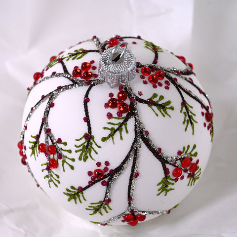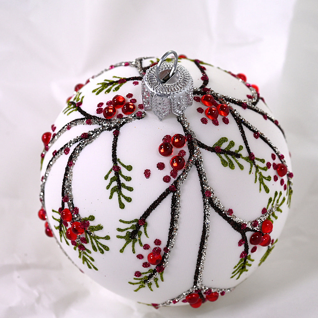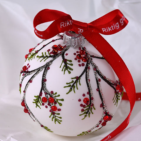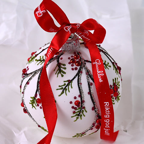 "Kristin" julekule i munnblåst, håndmalt glass. 8 cm julekule i en rålekker matt, helt kritthvit bunnfarge, med dekor i rødt, sølv og grønt. Denne hvitfargen har en finish som kan minne litt om fløyel - produsenten kaller den "white velvet".
