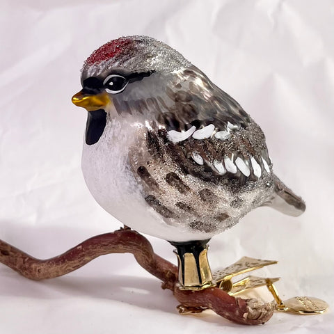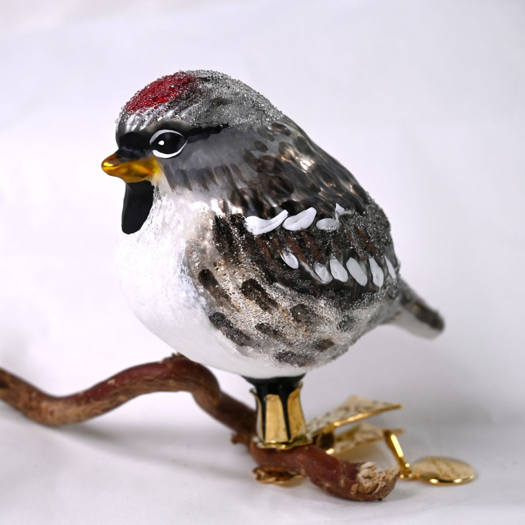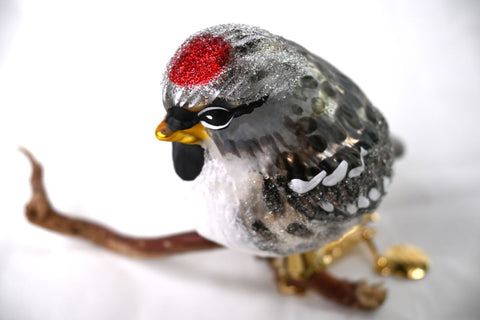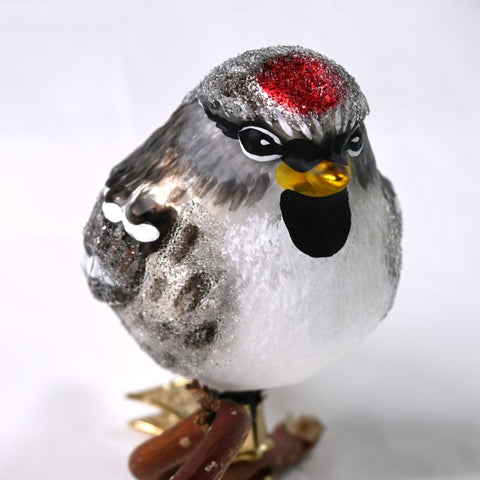 Gråsisik på clip, ca 8 cm høy og 10 cm fra nebb til haletipp.  Munnblåst glass (figurer og egg blir blåst i en form, kuler blir blåst «fritt»), dekorert for hånd.