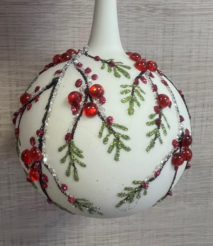 Liten "Kristin" julekule i munnblåst, håndmalt glass. 6 cm julekule i en rålekker matt, helt kritthvit bunnfarge, med dekor i rødt, sølv og grønt. Denne hvitfargen har en finish som kan minne litt om fløyel - produsenten kaller den "white velvet".