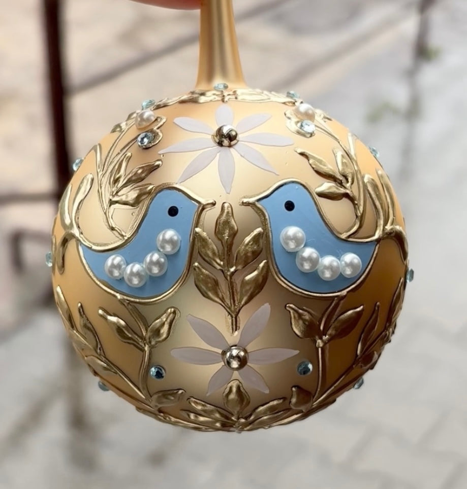 Vi er stolte over å kunne presentere vakre Esperanta, vår mest forseggjorte julekule noensinne. En helt unik skatt, designet for Glassklart av Gry Solberg Ekornholmen, munnblåst og dekorert for hånd av de dyktige glasskunstnerne hos vår faste produsent utenfor Krakow. Denne julekulen er et helt lite eventyr i seg selv. Den er dekorert med en teknikk vi ikke har sett før, med et elegant gullmønster som snirkler seg rundt kulen og er påført i et tykt lag. Dette krever virkelig et godt håndlag! Legg også merke til hvordan de ulike dekorperlene er perfekt avstemt og bidrar til det luksuriøse uttrykket.